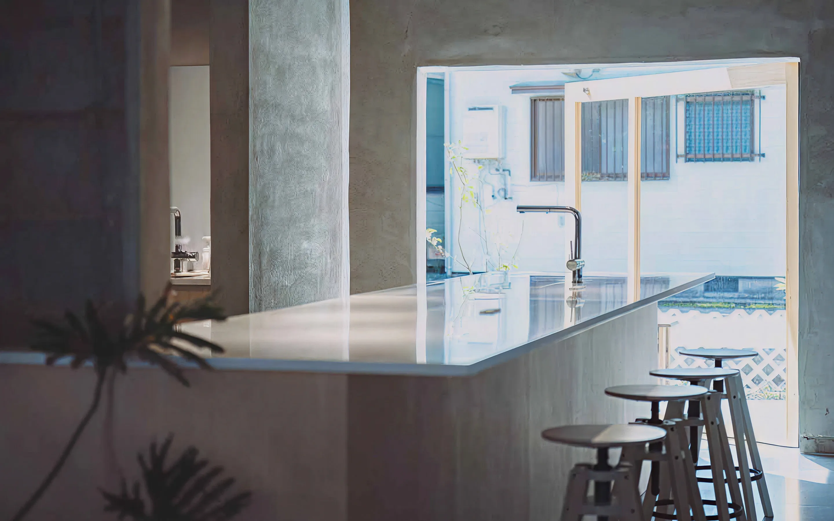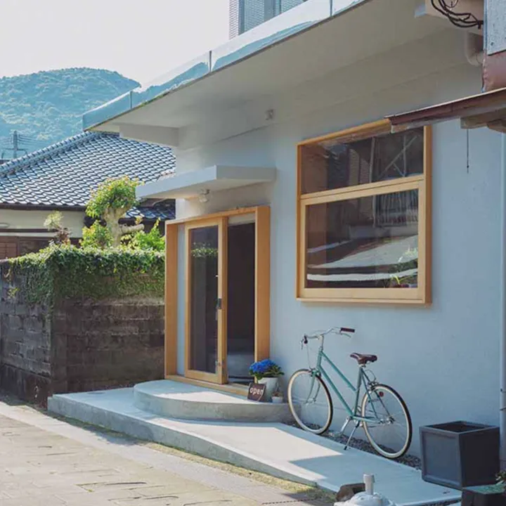 建築設計は、店主たっての希望で建築家・矢橋徹さんに依頼。元の建物を生かし、港町の風景になじむように整えました。中(地元)の人と、外(旅)の人が、自然にまざり合う光景を思い描いてつくられた空間は、まるで光と風のあそび場。ふらりと旅の途中で立ち寄る人も、日常のなかで、ほっと一息つきたい地元の人も。誰にとってもひらかれた、まちの休憩所のようなカフェでありたいと思っています。